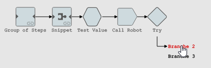 Certains éléments de la structure du robot sont cliquables, ce qui signifie que vous pouvez cliquer dessus et accéder aux sections respectives de la vue d'ensemble qui les décrivent. Par exemple, les étapes Groupe, les snippets et les branches ont leurs propres sections dans la vue d'ensemble du robot, et vous pouvez accéder à ces sections en cliquant sur l'élément de l'étape Groupe, le snippet ou le nom de branche dans la structure du robot, ou en faisant défiler la vue d'ensemble. Lorsque vous déplacez le pointeur sur un élément cliquable, le curseur se transforme en pointeur à doigt.
