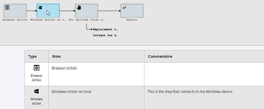 Lorsque vous déplacez le pointeur sur une étape à l'intérieur de la structure du robot, elle est mis en surbrillance dans le tableau avec la description des étapes.