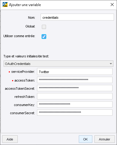 - Au robot, ajoutez une nouvelle variable de type complexe OAuthCredentials et sélectionnez Utiliser comme entrée.