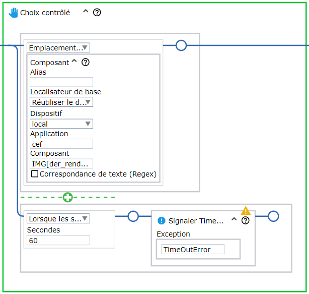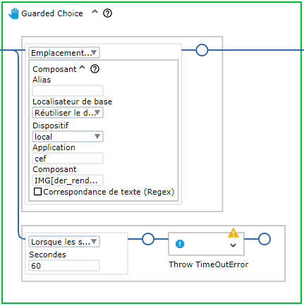 L'étape Choix contrôlé sert à définir un certain nombre de conditions, chacune associée à des activités Quelle que soit la condition ou le garde qui est satisfait en premier, les activités ou les étapes qui y sont associées sont exécutées. Cette fonction est souvent utilisée pour s'assurer qu'un élément de l'interface, tel qu'un bouton, est présent avant d'essayer de le déplacer et de cliquer dessus. Pour éviter d'attendre indéfiniment, un garde de temporisation est ajouté. Dans Kofax RPA, vous pouvez utiliser des gardes d'emplacement et de temporisation pour vous assurer que le robot trouve les éléments nécessaires et fonctionne normalement.