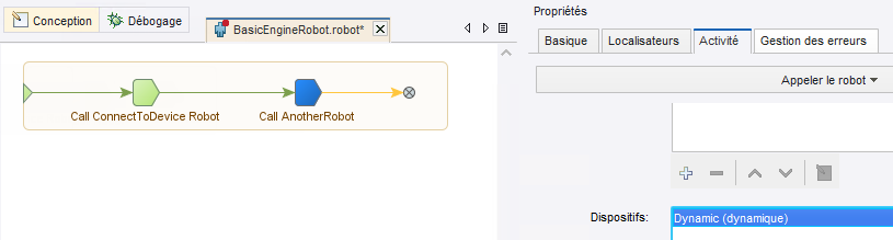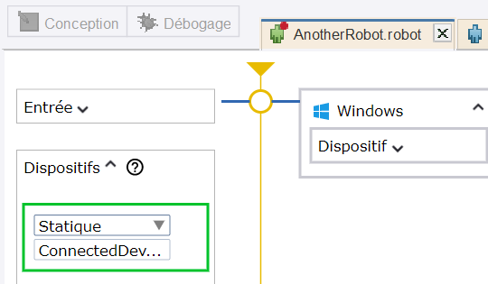 Un dispositif statique dans un robot est un dispositif avec lequel la connexion est déjà établie. Si un mappage dynamique est spécifié pour une étape Appeler le robot dans la propriété Dispositifs du Robot à Moteur Basique et que le dispositifs a déjà été connecté, ce mappage dynamique peut être transmis à un dispositif statique. En d'autres termes, si le dispositif est précédemment connecté à l'aide du mappage dynamique, dans le volet Dispositifs du robot, vous pouvez choisir d'utiliser un dispositif statique et de réutiliser la connexion établie avec le mappage dynamique. C'est pratique lorsque vous devez réutiliser ce robot dans différents Robots à Moteur Basique.