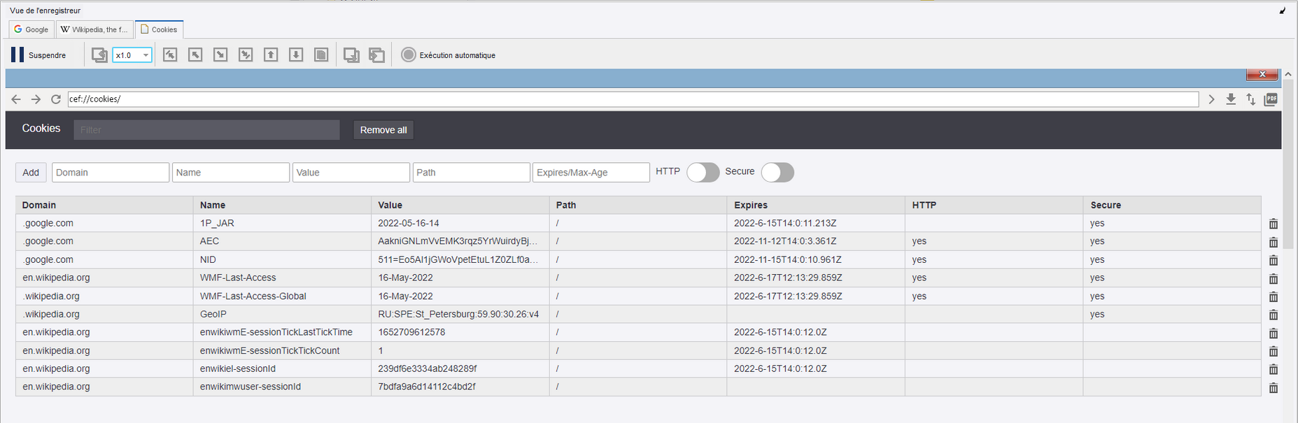 Utilisez le navigateur intégré du robot pour surveiller, ajouter ou supprimer des cookies du CookieStore.
