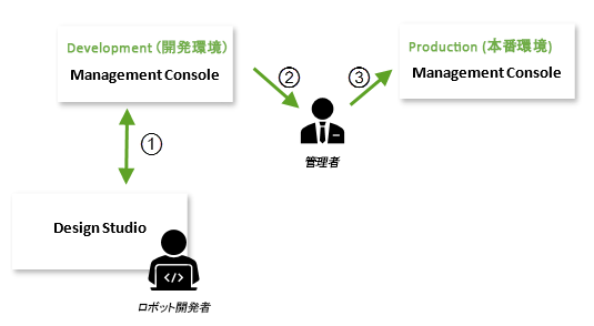 この設定例では、ロボット開発者は開発用 Management Console に保存されているプロジェクトとの同期を確立し (1)、新しいファイルや設定を作成するか既存のものに変更を加えて、この Management Console とプロジェクトを再同期します。
