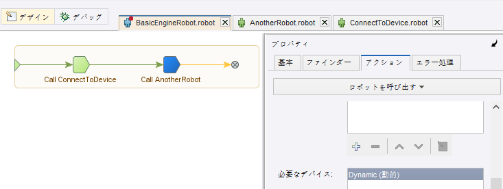 ロボット内の静的デバイスは、接続がすでに確立されているデバイスです。ロボットを呼び出すステップにベーシック エンジン ロボットの [必要なデバイス] プロパティで動的マッピングが指定されており、デバイスがすでに接続されている場合は、この動的マッピングが静的デバイスに渡されます。つまり、デバイスがすでに動的マッピングを使用して接続されている場合は、ロボットの [デバイス] ペインで静的デバイスの使用を選択することで、動的マッピングを使用して確立された接続を再利用できます。これは、このロボットを別のベーシック エンジン ロボットで再利用する必要がある場合に便利です。
