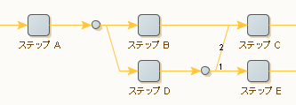 このロボットで、ステップ A の後に分岐ポイントが続き、接続は 2 つの分岐に分かれています。1 つの分岐はステップ B とステップ C から構成され、もう 1 つの分岐はステップ D とステップ E から構成されます。分岐ポイントから出るすべての分岐は次々に実行されます。そのため、エラーまたはテスト ステップで管理フローが変更されず、各ステップで 1 つの出力ロボット状態が生成される場合、先行ロボットは次のように実行されます:A、B、C、D、E。ただし、ステップ B とステップ D はそれぞれステップ A によって生成されたものと同じ出力ロボット状態のコピーを受け取ります。