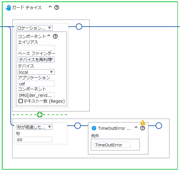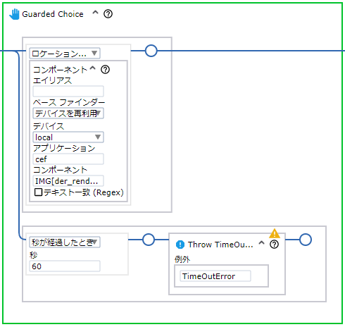 ガード チョイス ステップは、複数のアクションと関連付けられた多くの条件を設定する際に使用します。条件またはガードのいずれかが最初に満たされると、その関連付けられているアクションまたはステップが実行されます。これは一般的に、ボタンなどのインターフェイス エレメントに移動してクリックをする前に、エレメントが存在することを確認するために使用されます。無制限に待機しないように、タイムアウト ガードが追加されます。Kofax RPA では、ロケーションとタイムアウト ガードを使用して、ロボットが必要なエレメントを見つけ、設計どおりに動作するようにできます。