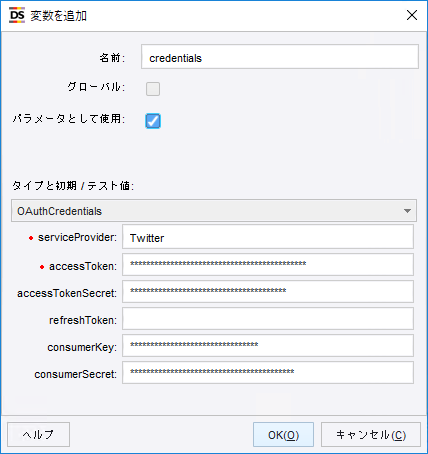 2. ロボットに対して、コンプレックス タイプの新しい変数 OAuthCredentials を追加し、[パラメータとして使用] を選択します。