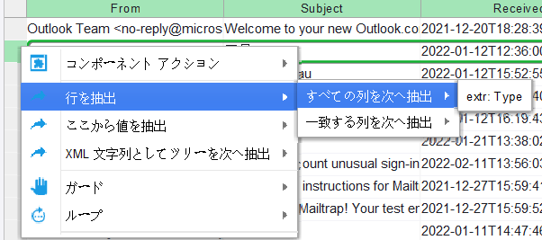 属性名とそのタイプのみに一致する列からデータを抽出するには、行の左にあるインジケータを右クリックし、 の順に選択します。ロボットのワークフローに、選択したコンプレックス タイプに一致するセルの数と同じ数の [データの抽出] ステップが表示されます。データを編集および設定し、ロボットのワークフローの次のステップに進みます。