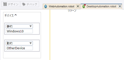 • ロボット内の静的デバイスは、接続がすでに確立されているデバイスです。ロボットを呼び出すステップにベーシック エンジン ロボットの [デバイス] プロパティで動的マッピングが指定されており、デバイスがすでに接続されている場合は、この動的マッピングが静的デバイスに渡されます。つまり、デバイスがすでに動的マッピングを使用して接続されている場合は、ロボットの [デバイス] ペインで静的デバイスの使用を選択することで、動的マッピングを使用して確立された接続を再利用できます。これは、このロボットを別のベーシック エンジン ロボットで再利用する必要がある場合に便利です。