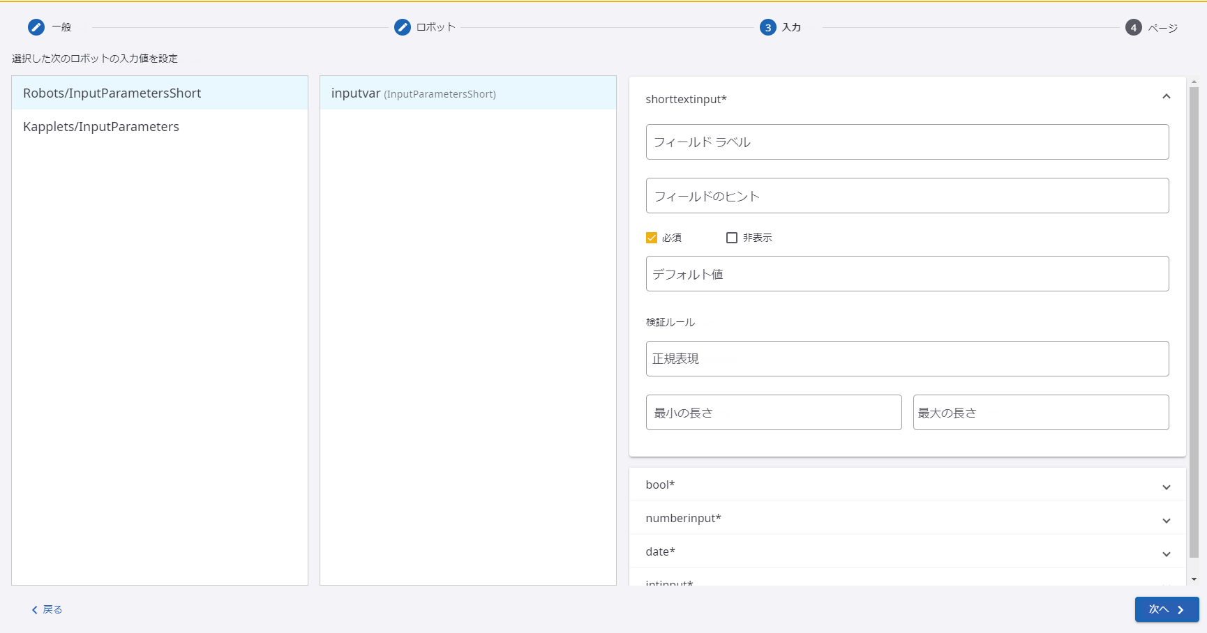 [入力] ページで入力パラメータと検証ルールを設定すると、それらは自動的に検証されます。エラーが返された場合は、入力パラメータおよび/または対応する検証ルールを修正してください。入力が有効な場合、[次へ] ボタンがアクティブになります。