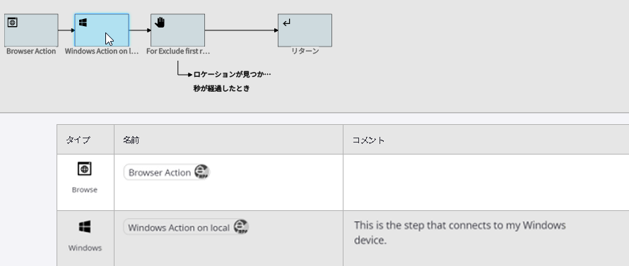 | 名前 | ステップまたはステップのグループの名前。 ロボットを呼び出すステップの場合は、呼び出されるロボットの名前も含まれます。 |