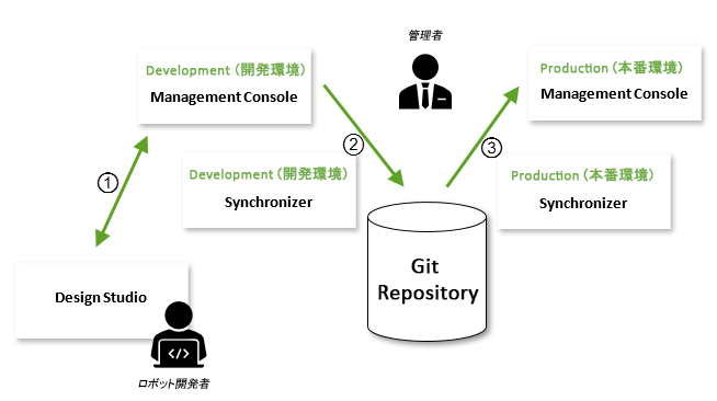 この設定例では、ロボット開発者は開発用 Management Console に保存されているプロジェクトとの同期を確立し (1)、新しいファイルや設定を作成するか既存のものに変更を加えて、この Management Console とプロジェクトを再同期します。