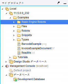 [Management Console] セクションには、接続している Management Console のロボット プロジェクトとデータベースを表す、展開および折りたたみ可能なツリー構造が表示されます。