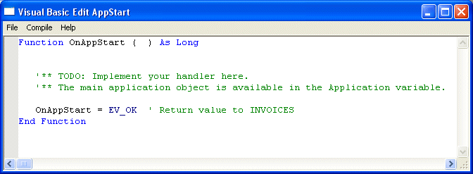 All VBA code is color-coded as you type it. The colors are controlled by the INVOICES_VBA.ini file located in the ReadSoft Invoices Bin directory.