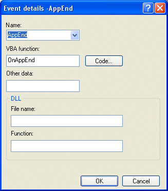- Specify any VBA function to be called, the name of a DLL and DLL function, or both.