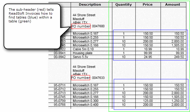 A sub-header is a line item field that can signify the beginning of a new table within a table. These can occur within purchase order invoices that cover two or more purchase orders, for example.