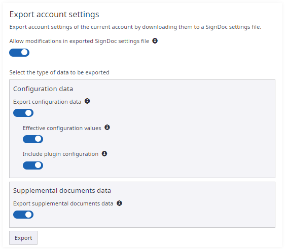 Account settings are exported by downloading a SignDoc settings zip file. Depending on the selected options, this zip file contains a configuration.json and/or a doctypes.json file which contain the exported data in JSON format.