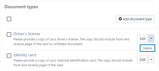 An account administrator can manage document types assigned to an account. A document type is a template which defines a group of supplemental documents.