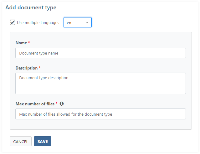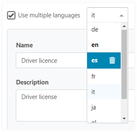 To add multiple translations to the document type, a user has to provide the English translation first. Then you can use the Use multiple languages check box to enable multiple translations for the document type. When selecting this option, the application displays the translation list. When you change the selected language and enter Name, Description and Max number of files, you enter the values for the selected language.