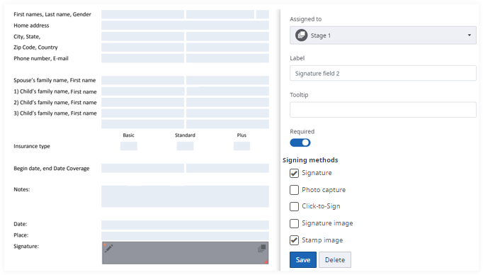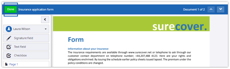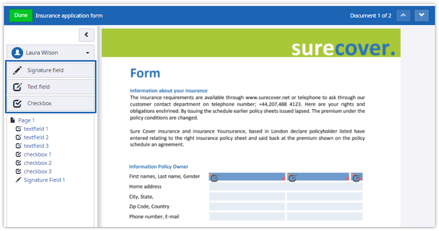 Select the signer and add fields by dragging them from the panel into the document body. The following field types can be added: