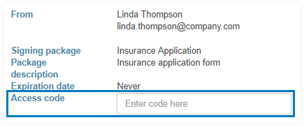 SignDoc Standard offers authentication based on access code. The recipient enters the code in the field next to Access code.