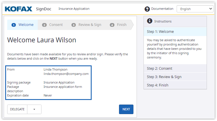 The application checks if a preferred language is set for the signer, and uses that language for the signing session. If the preferred language is not set, it applies the default language for the user's browser. English is used if the default language is not confirmed.
