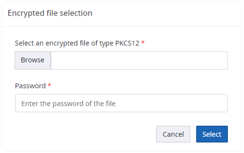 By clicking Select a dialog is displayed in which you can choose an encrypted file by clicking Browse and enter the password of the file.