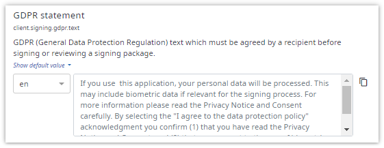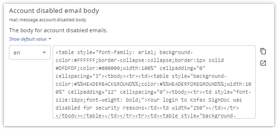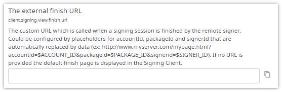 Use to enter a text or a number value for the current account. Default values are displayed as placeholder text (in Internet Explorer, default values are displayed on top of the input field). By entering a value for this account, the default value is overwritten. To use the default value you have to clear the text or the number of the input field. On the right there is an icon which copies the current value to the clipboard. This is useful when the current value is lengthy and handled better in an external text editor. Some of these text input elements are localizable. See Working with localizable strings for more information.