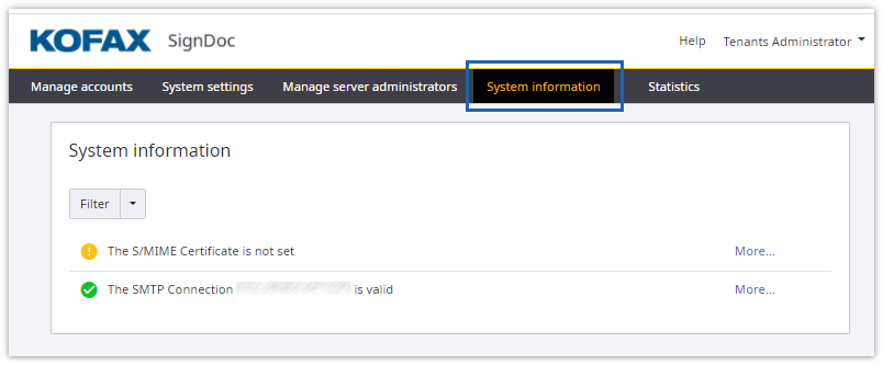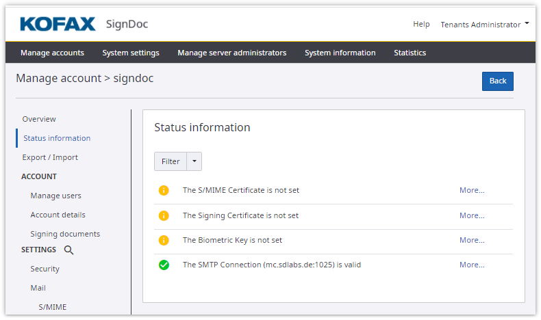 Each account has its own status information on certificates, licenses, keys, and connection. Specific account status information is presented in the Edit an account section.