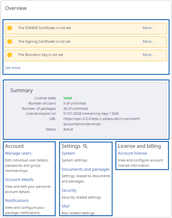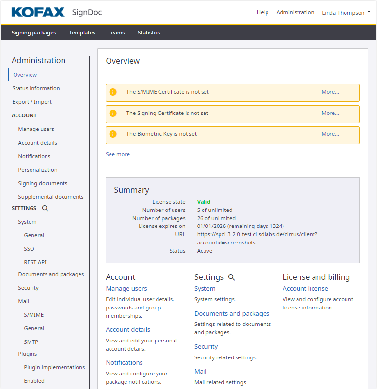 Displays both the number of signing packages created within this account, as well as the maximum number of signing packages permitted for this account based on the current license.