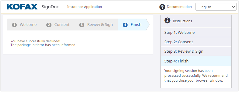 The recipient sees a message that the signing has been declined, and the signing package initiator has been informed.