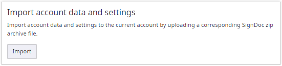This page provides the possibility to export and import account settings. This can be used to backup account settings, to transfer settings from one account to another or to transfer account settings from one SignDoc installation to another.