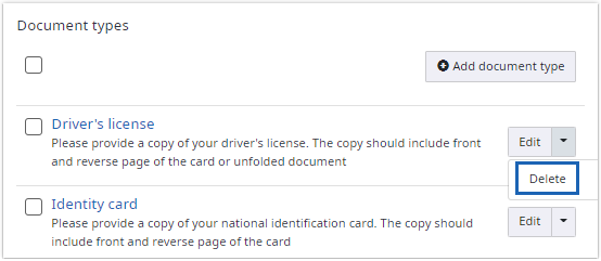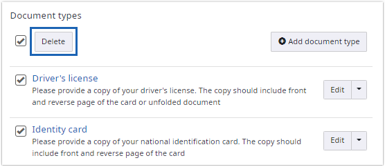 Bulk delete is also supported: an account administrator can select several document types and click Delete in the header of the Document types table.