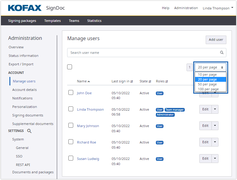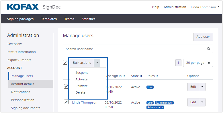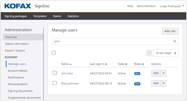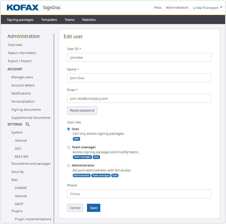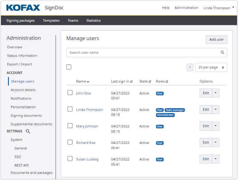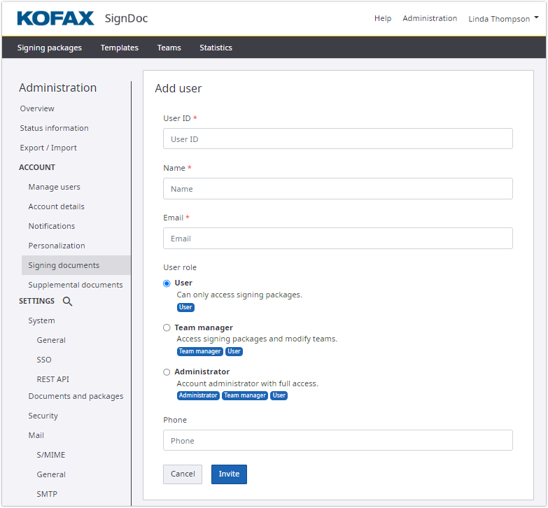In this section, the account administrator assigns roles to users. With the role User, only signing packages can be accessed. With the role Team manager, additional teams can be modified and signing packages can be accessed. The role Administrator has full access to the account.