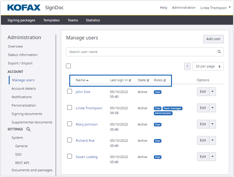 Users can be sorted by the columns Name, Last sign in, State, Roles.