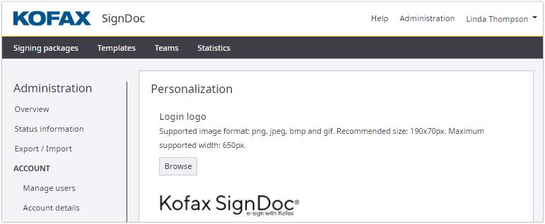 The personalization is visible to both the package owners and signing package recipient. Using the personalization options, you can set logos, headers, and footers.