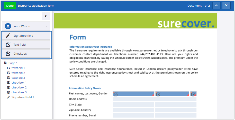 Select the signer and add fields by dragging them from the panel into the document body. The following field types can be added: