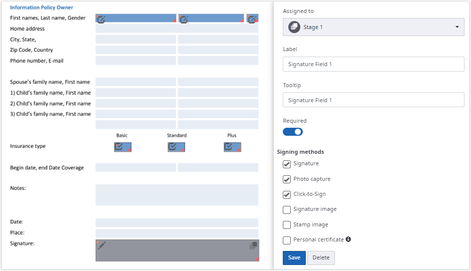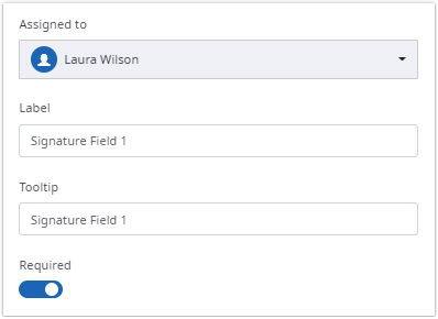 Fields assigned to a stage appear in grey, having a stage icon on the upper right. Fields assigned to a stage can be edited like fields assigned to a signer.