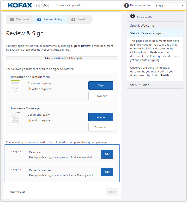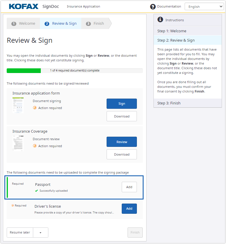 Once all required supplemental documents are provided and all documents of the signing package are completed, the Finish action is available for the signer.
