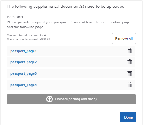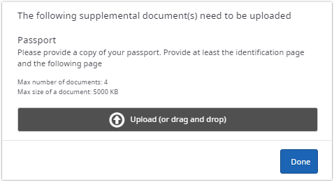 For some services such as consumer loan applications, signers are required to upload supplemental documents during the signing process. Examples of such documents are scans of ID documents (driver's license, photo ID), proof of residence, or proof of income (pay slip).