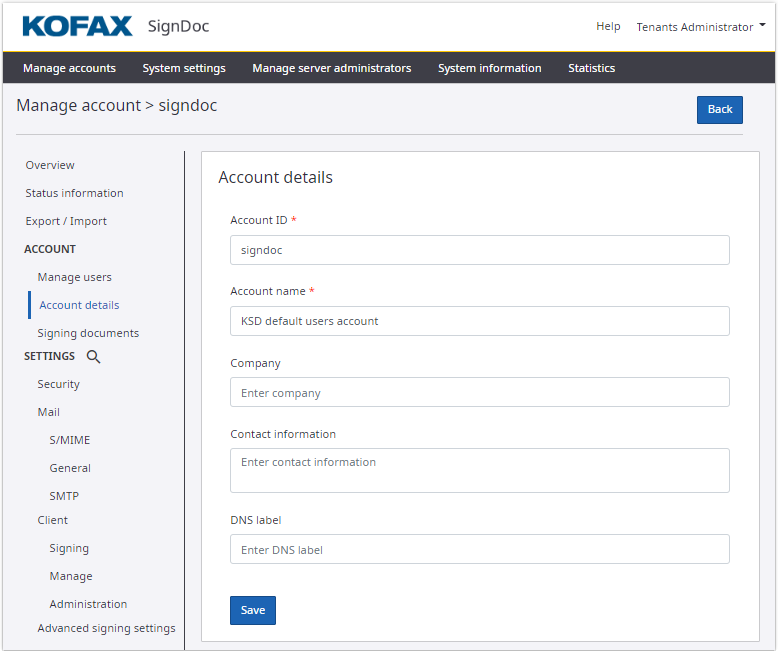DNS label: Allows this SignDoc Standard account to be accessible via a subdomain. For example, if your company’s account should be accessible via the URL yourcompany.kofax-signdoc.com, the label "yourcompany" will appear in the DNS label field. This field is configured upon creation of this account by the server administrator and is not editable.