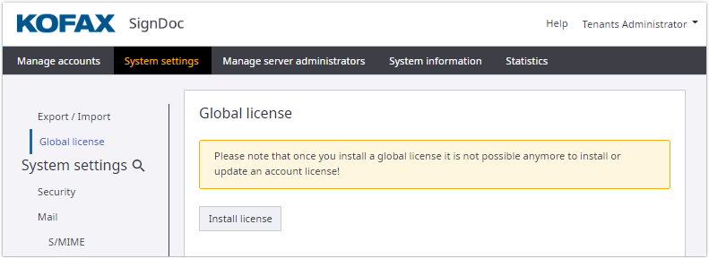 To install a global license, open the Administration Center, log in as a server administrator, go to the System settings link, and select the Global license category.