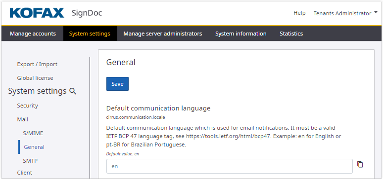 Mail messages and other mail related settings can be configured selecting General in the Mail section. Here content of messages, event notifications and languages can be set either globally or for the account level via Manage accounts section.