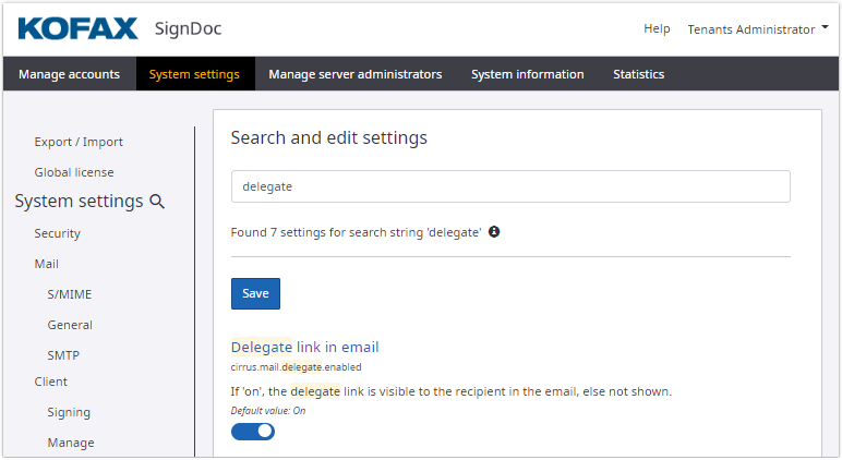 When you click the System settings link in the navigation panel the Search and edit settings page is displayed where you can search for a specific setting by typing in a search term.