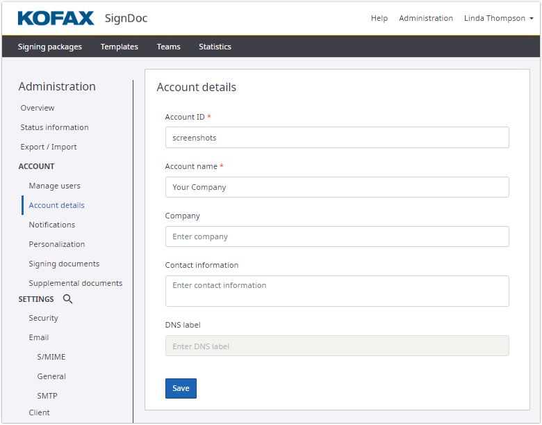 This label allows this SignDoc Standard account to be accessible via a subdomain. For example, if your company’s account should be accessible via the URL yourcompany.kofax-signdoc.com, the label "yourcompany" appears in the DNS label field. This field is configured upon creation of this account by the server administrator and is not editable.