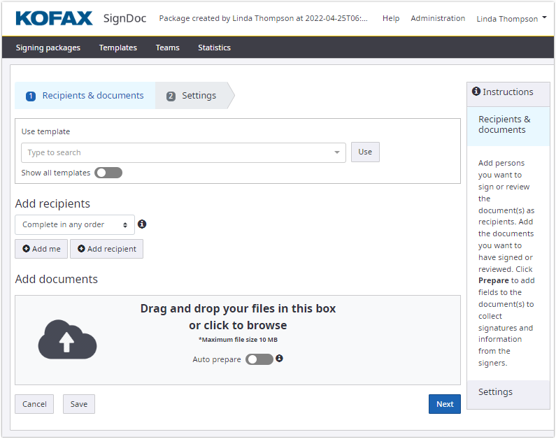 - Add recipients. See Add recipients to signing package.