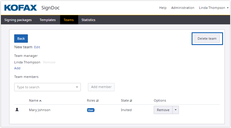 - After the team is removed from the list of teams, click Back to return to the Teams page.