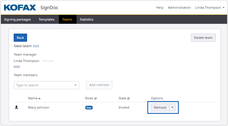 This functionality is only available when accessed by SignDoc Standard user who is assigned to the team manager role for this team, or who is an account administrator.