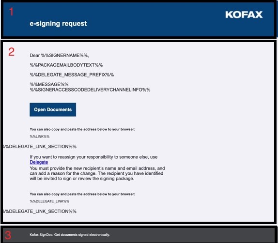 Basic Kofax e-signing notification looks like below. It has three main sections: