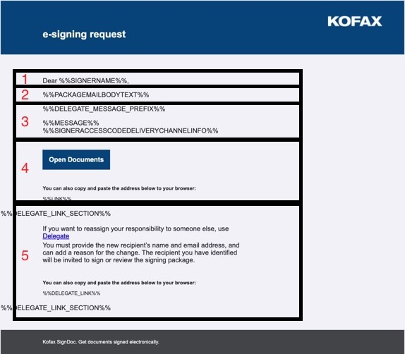 <table style="font-family:arial;background-color:#F4F4F8;color:#32323c;width:100%;"><tbody><tr style="background-color:#6b4a4a;color:#fff;width:100%;font-size:24px;font-weight:bold"><td style="padding-left:80px;height:80px">Documents for e-signing</td></tr><tr style="background-color:#F4F4F8;color:#32323c;width:100%;"><td style="padding-left:80px"><br/><p>Package "%%PACKAGENAME%%" for %%SIGNERNAME%%.</p><p>%%PACKAGEMAILBODYTEXT%%</p><p>%%DELEGATE_MESSAGE_PREFIX%%</p><p>%%MESSAGE%% <br/>%%SIGNERACCESSCODEDELIVERYCHANNELINFO%%</p><br/><p style="-webkit-border-radius:2px;-moz-border-radius:2px;border-radius:2px;color:#ffffff;"><a href="%%LINK%%" style="color: #ffffff;background-color:#600101; padding:15px; font-size:16px; font-weight: bold; font-family: Helvetica, Arial, sans-serif; text-decoration: none;">Open Documents</a></p><br/><p style="font-size:12px"><b>You can also copy and paste the address below to your browser:</b></p><p style="font-size:12px">%%LINK%%</p></td></tr><tr><td>%%DELEGATE_LINK_SECTION%%</td><td height="20px"></td></tr><tr style="background-color:#F4F4F8;color:#32323c;width:100%;"><td style="padding-left:80px"><p>If you want to reassign your responsibility to someone else, use <a href="%%DELEGATE_LINK%%" style="font-size:16px;font-family:Helvetica,Arial,sans-serif;">Delegate</a><br/>You must provide the new recipient’s name and email address, and can add a reason for the change. The recipient you have identified will be invited to sign or review the signing package.</p><p style="font-size:12px"><b>You can also copy and paste the address below to your browser:</b></p><p style="font-size:12px">%%DELEGATE_LINK%%<br/></p></td></tr><tr><td>%%DELEGATE_LINK_SECTION%%</td><td height="20px"></td></tr><tr style="background-color:#696464;color:#fff;width:100%;font-size:12px;"><td style="padding-left:80px;height:40px">Kofax SignDoc. Get documents signed electronically. </td></tr></tbody></table>
